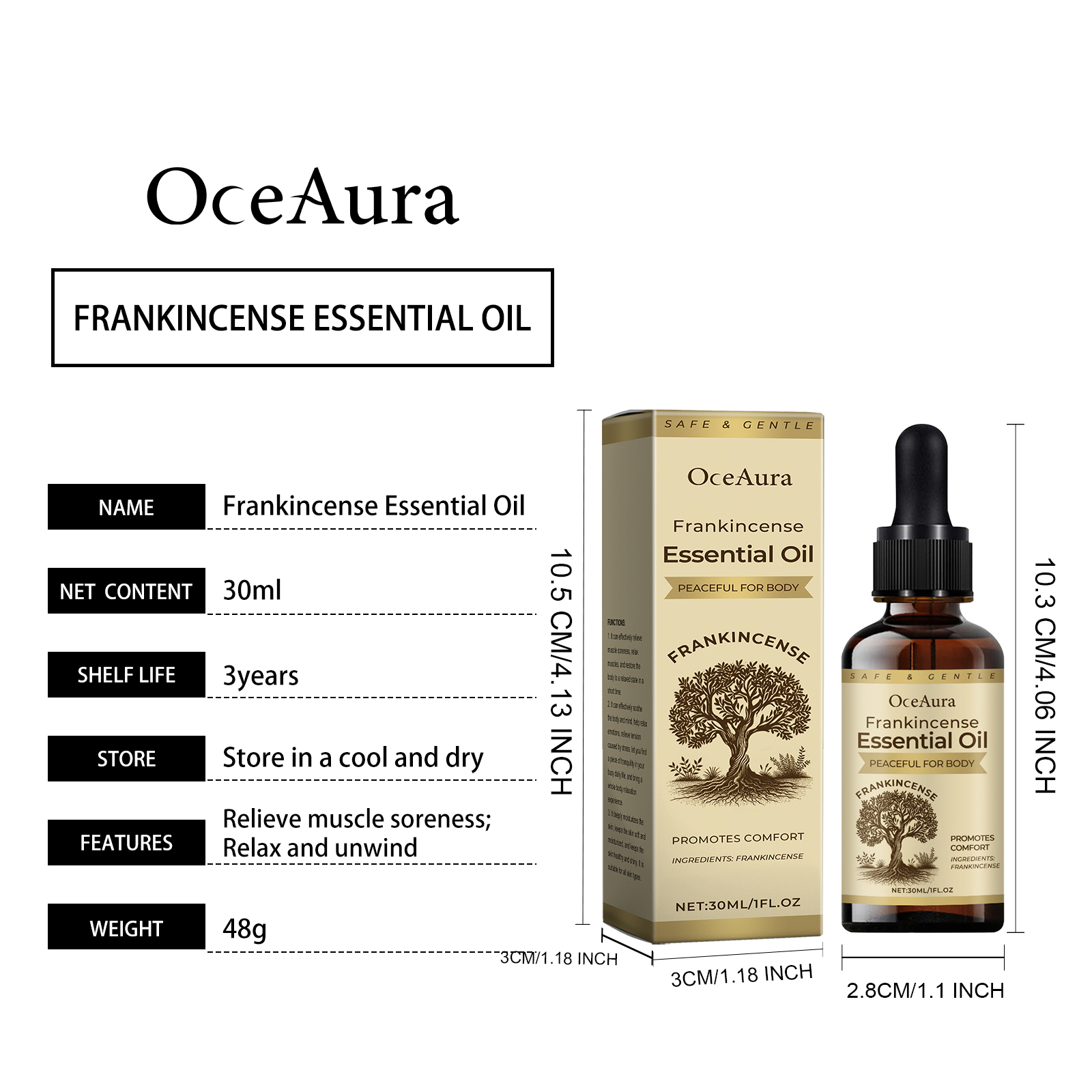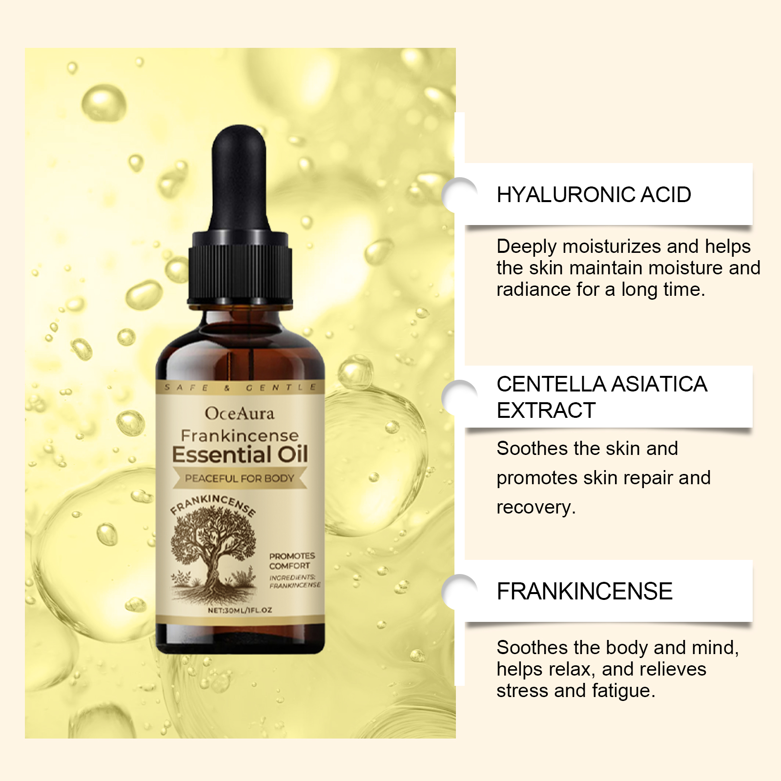 Our Body Frankincense Essential oil contains Frankincense, sapindus fruit extract. It relieves fatigue, is suitable for daily use, and improves physical comfort. The way to use it is simple: clean the skin and keep it dry. Apply appropriate amount of this product evenly on the body skin. Massage gently in circular motions to promote absorption. It can effectively lock in moisture and keep skin soft and smooth for a long time.